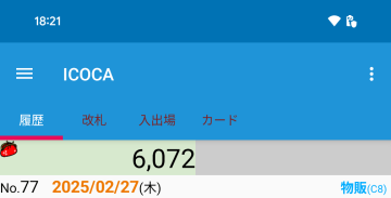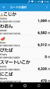 カードを選択すると、最大50件、過去の分が表示されます。カードにより残額もあわせて表示されます。